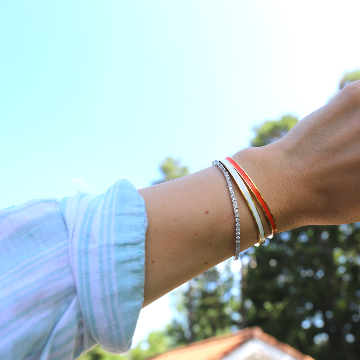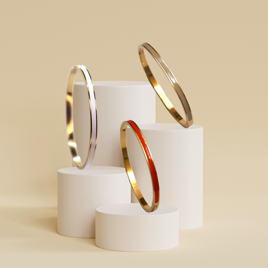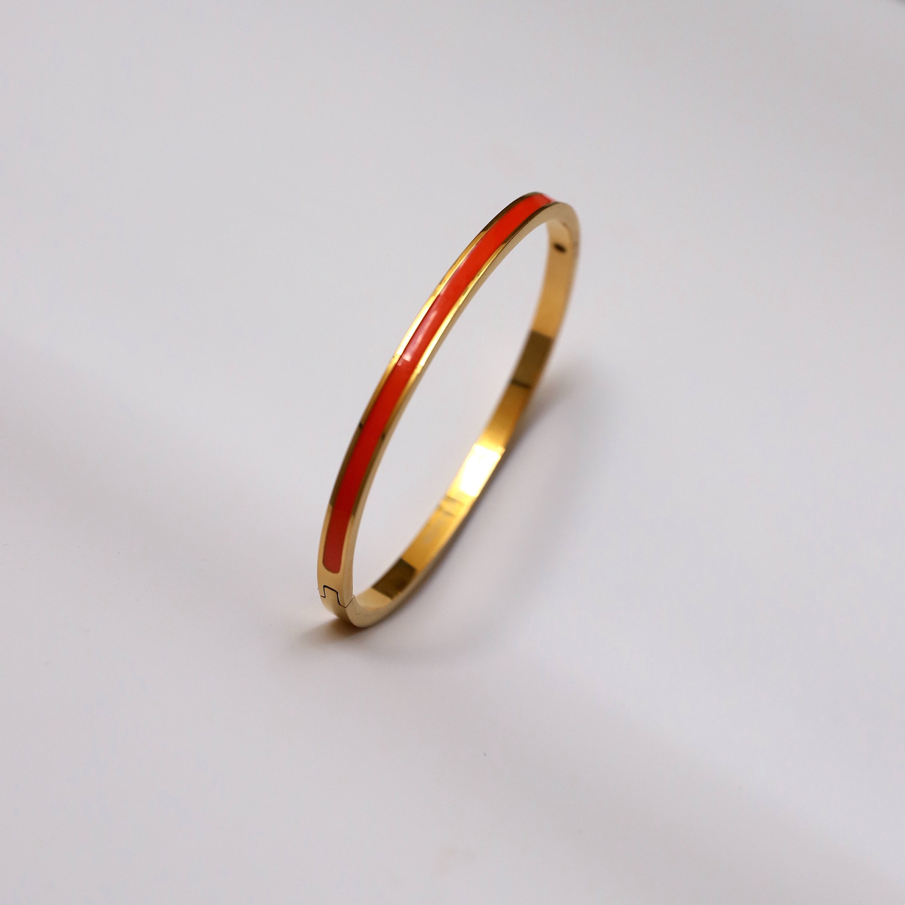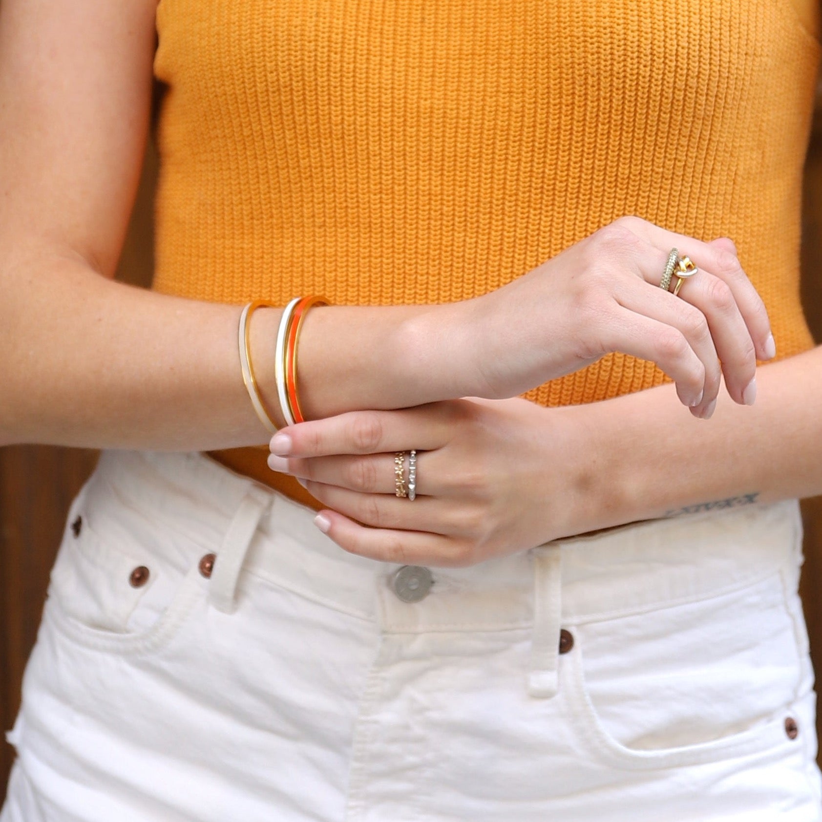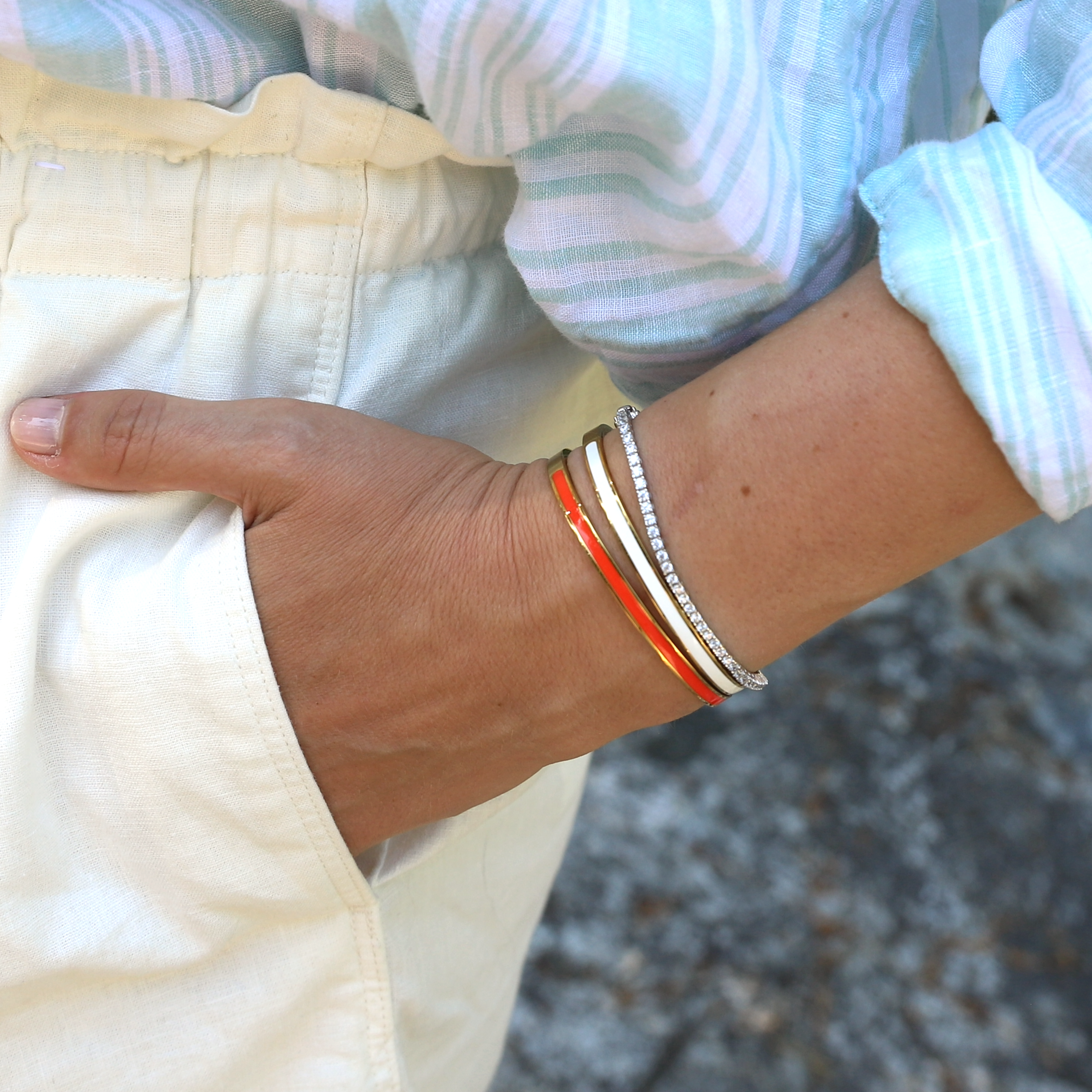 Välj mellan färgerna orange, beige och vit. Varje färg har sin egen personlighet och kan anpassas efter din stil. Det orange armbandet ger en livfull och energisk känsla, medan det beige ger en varm och mjuk touch. Det vita armbandet ger en ren och tidlös look.